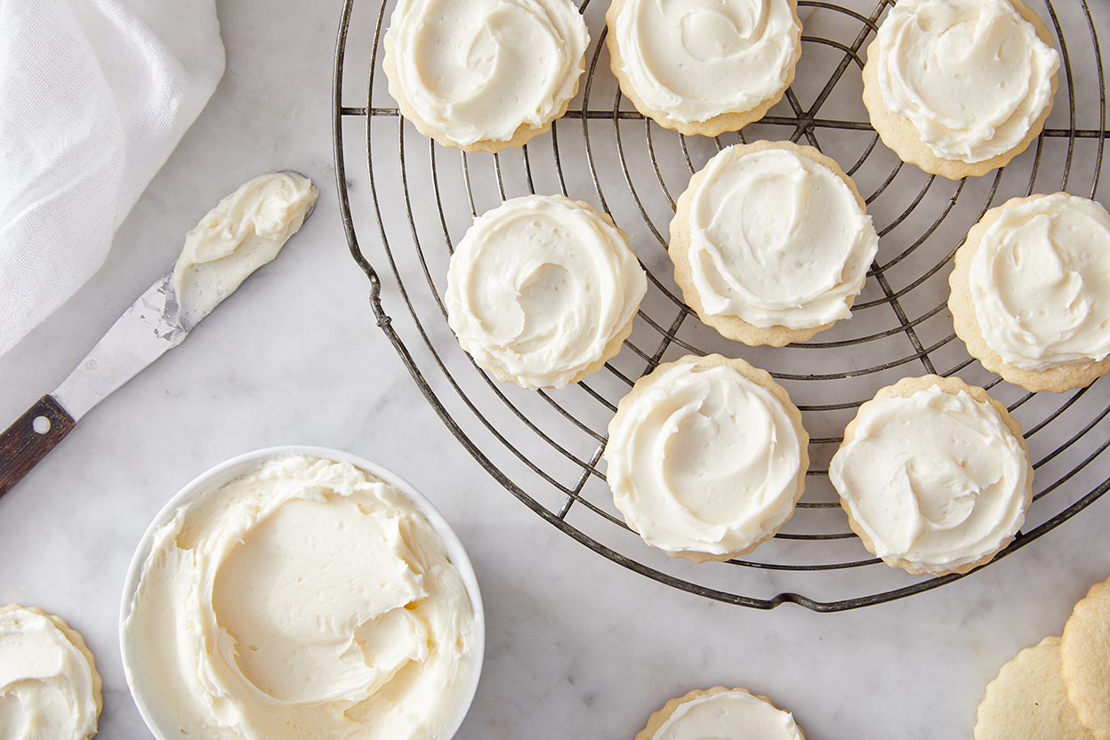 Light and fluffy, this white frosting is perfect for piling on top of cookies. Flavor however you wish; our favorite is a mixture of vanilla and almond. This frosting stays light and moist, and is similar to American buttercream — but a whole lot easier to make.