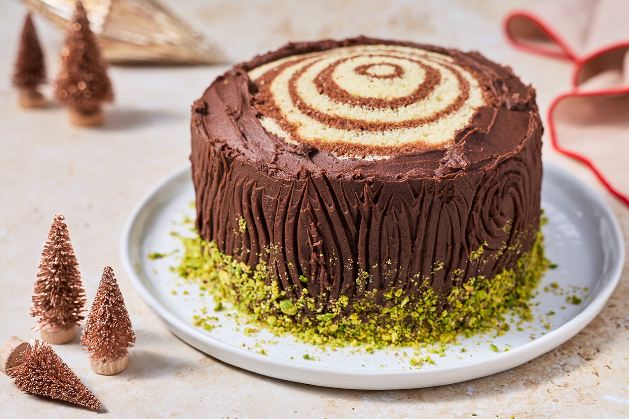 When the frosting is set, apply more frosting to the sides of the cake, avoiding the top, which will be left bare to show off the “rings” of the tree stump cake. Drag the tines of a fork over the sides of the frosted cake in a wavy pattern to create a bark-like appearance. Sprinkle ground pistachios around the edge of the cake to mimic moss, if desired. Slice and serve at room temperature.