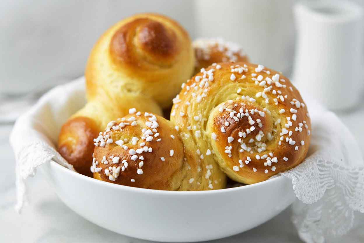 Brush each bun with some of the egg white/water glaze. Sprinkle with coarse white Swedish pearl sugar.