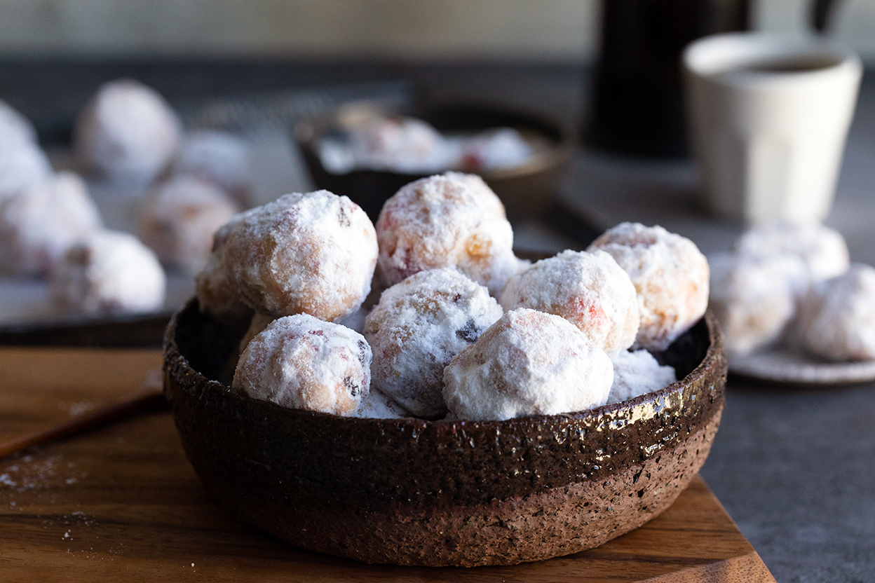 Stollen, but make it bite-sized! These sweet treats are a fun and unique choice for a cookie swap or an unexpected addition to a cookie plate. Packed with dried fruit and toasted nuts, they’re rich and tender with a flavor profile that embodies the holiday season in one bite!