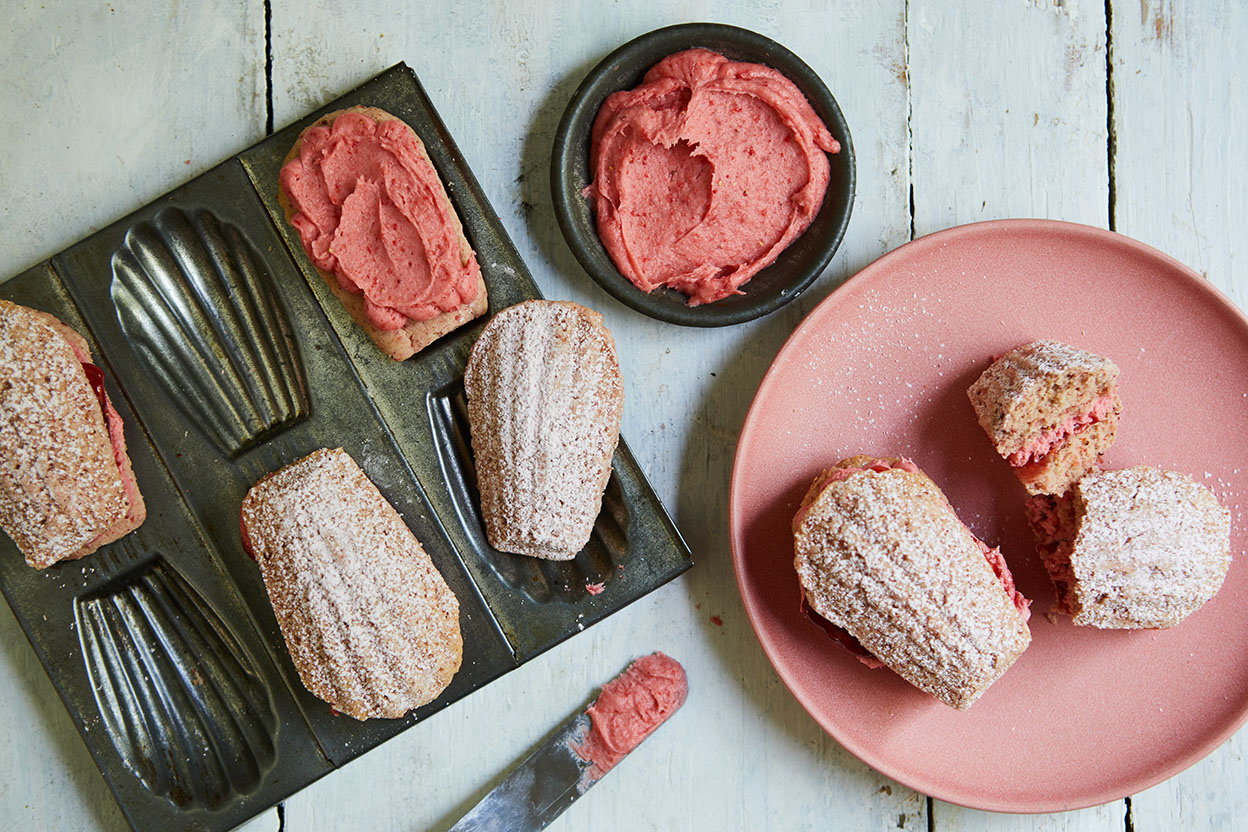 To assemble: Spread 2 teaspoons of filling on the bottom of half the madeleines; spread a teaspoon of preserves on the bottom of the remaining madeleines. Sandwich the jam-topped and filling-topped madeleines together. Dust with confectioners’ sugar before serving.