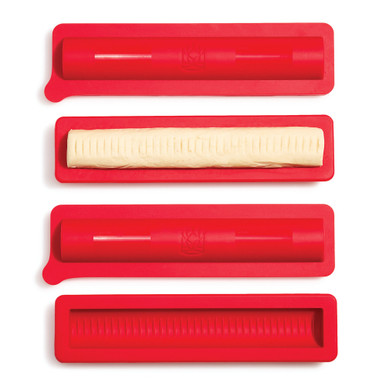 To assemble: Working on a piece of parchment or on a clean, lightly floured surface, divide the vanilla dough into four pieces, about 88g each. Round each piece into a ball, then roll out into a log about 10" long. Divide the red dough into three pieces, about 58g each. Round each piece into a ball, then roll out into a log, about 10" long.