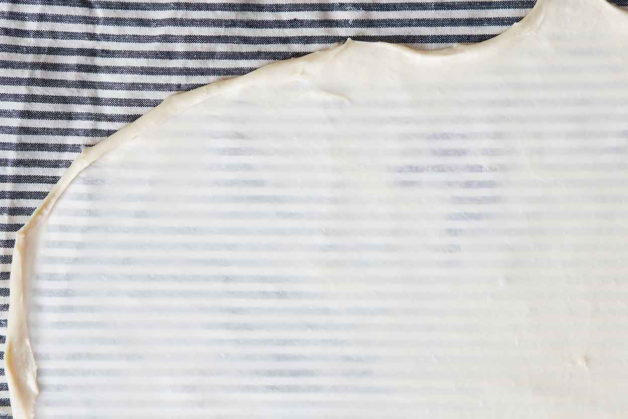 Working with one of the shorter sides, gently grab the dough and roll it up into a tight spiral. Use the tablecloth to help you — the less you handle the dough, the less likely you are to rip it.