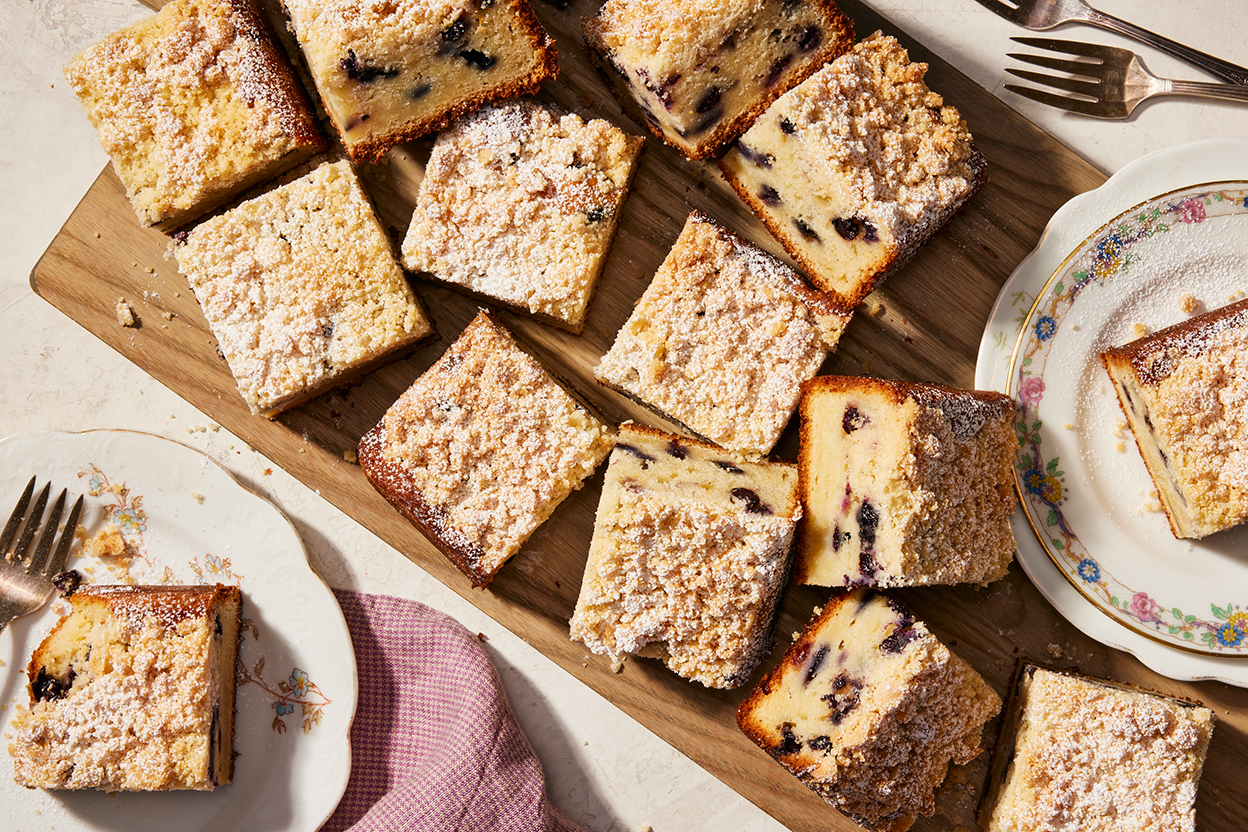 Sprinkle the remaining 1/2 cup (74g) blueberries evenly over the top of the batter, followed by the crumbs. Gently press the crumbs to adhere.