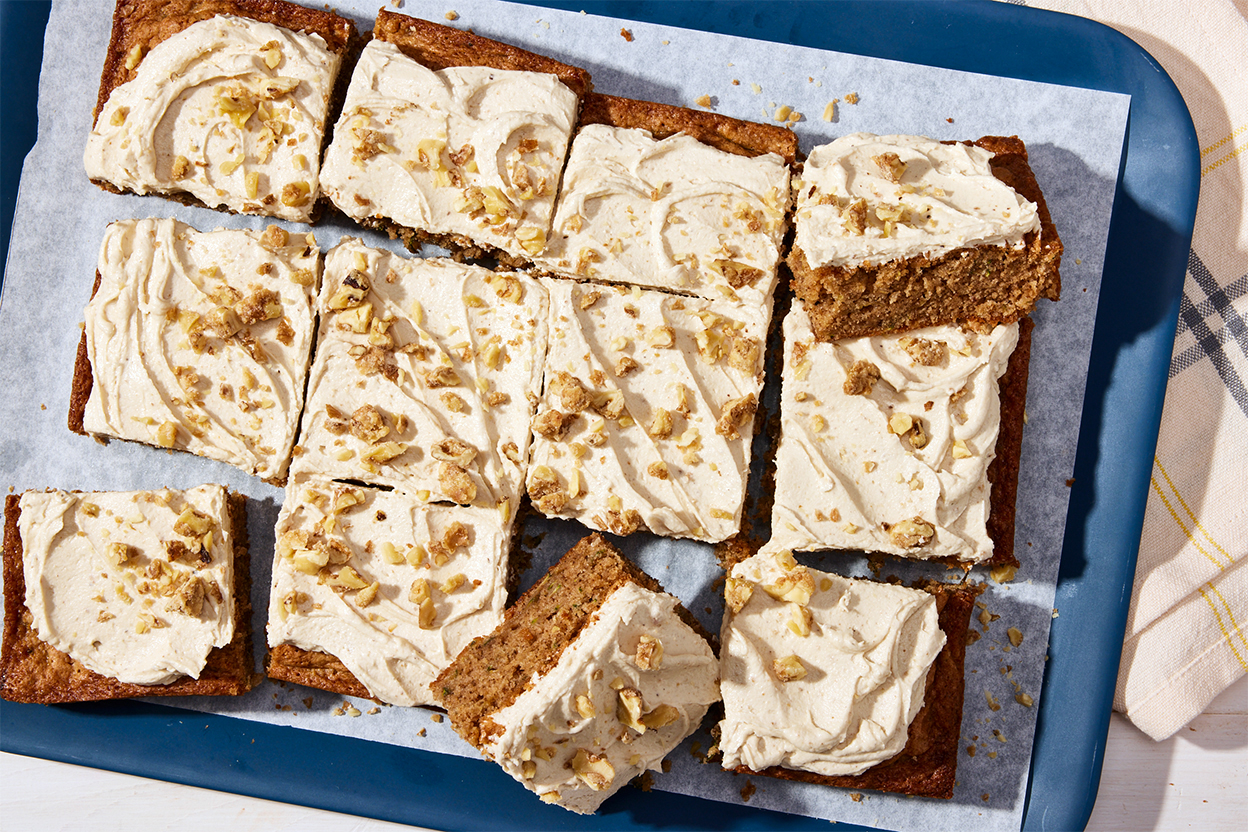 This summery crowd-feeding cake is like a spiced zucchini cake, only richer, moister, and more flavorful. That’s thanks to walnut praline, which is made by grinding up candied walnuts into a toasty, caramelly nut paste that’s used to sweeten both the batter and the frosting. The result is an irresistible cake with layered complexity. A scoop of tahini in the frosting brings home the nutty flavor, but if you’d prefer another topping, check out our suggestions in the “tips” below, or enjoy the cake unadorned.
