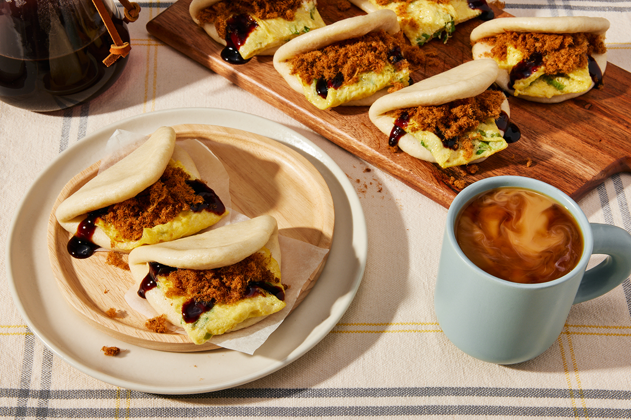 To assemble the breakfast bao: Fill each gua bao with a portion of omelet, then drizzle on soy paste to taste. Add about 1 tablespoon of pork floss per bun. Eat warm or at room temperature.