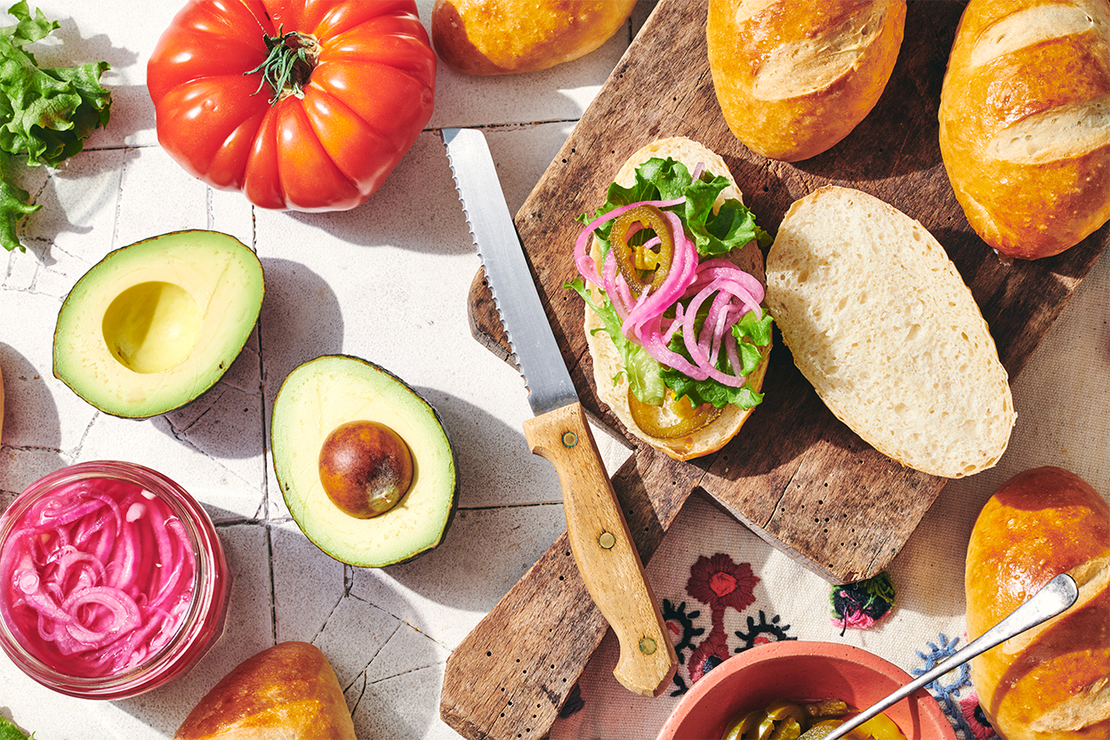 This staple bread for Mexican sandwiches is made in bakeries all over Mexico; it's a smaller cousin of French bread, with a softer texture inside, and a crispy crust on the outside. Telera rolls show up at any meal, split and adorned with any number of luscious fillings. Telera are most often used for the Mexican sandwich known as a torta, which usually contains mashed avocado, a spread made of black beans or refried beans, pickled jalapenos, lettuce, tomato, and onion.