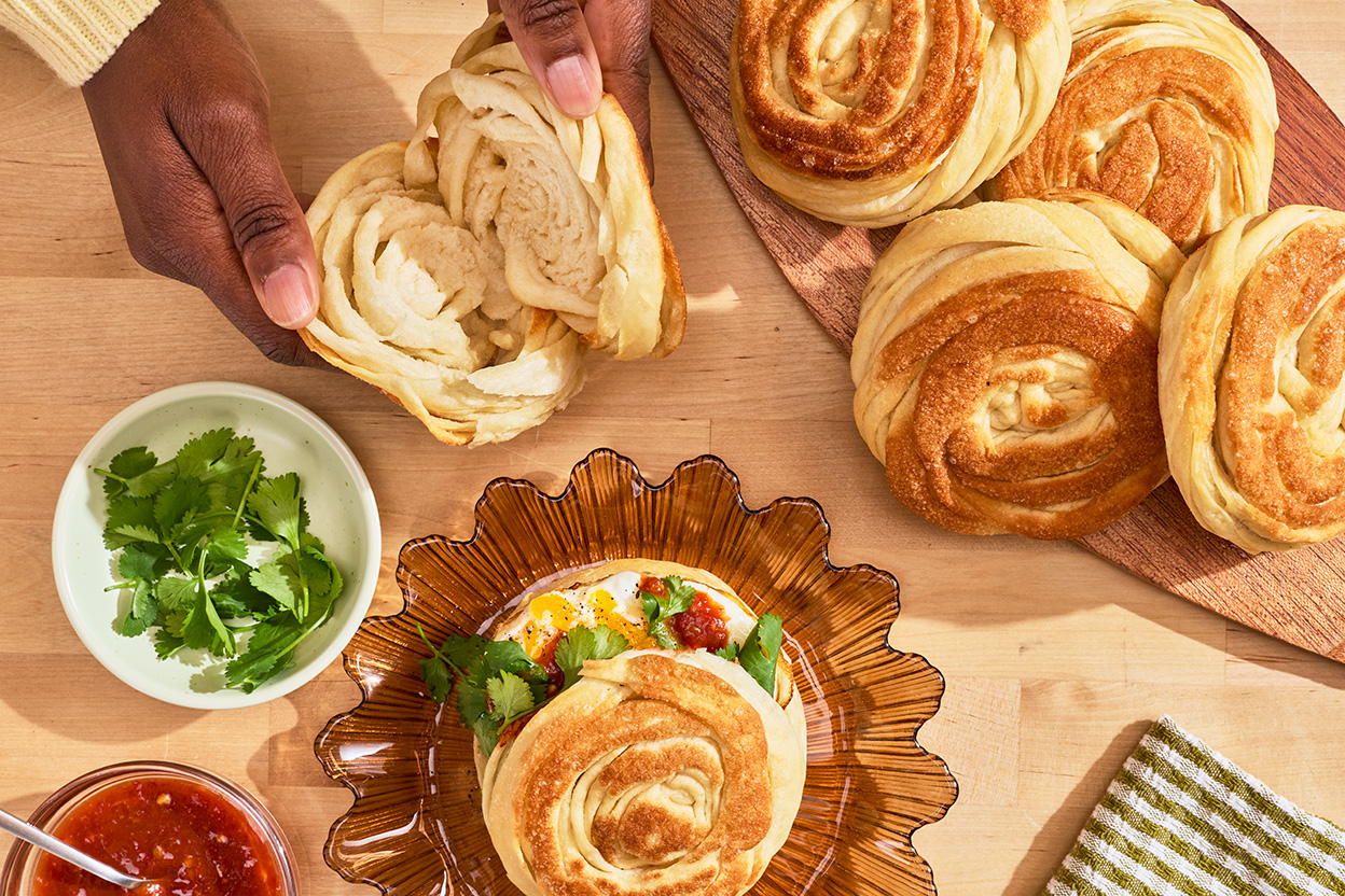 Repeat the rolling and shaping process (steps 4 through 7) with the remaining dough portions, placing the coils at least 3" apart on the baking sheet. Cover the shaped mo and allow the dough to relax for 10 minutes.