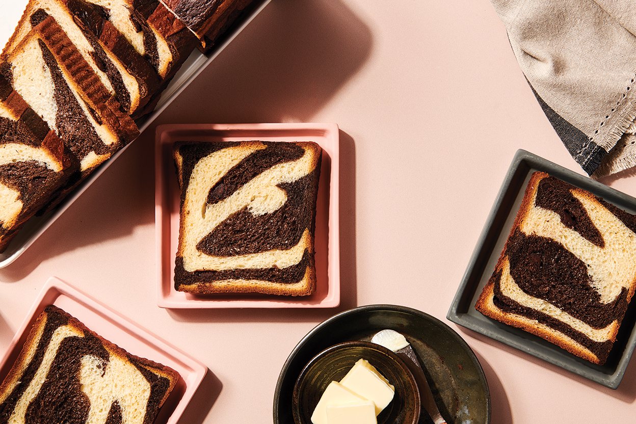 Return the smaller piece of dough to the mixer bowl and add the cooled cocoa mixture. Mix with the dough hook on medium speed until the cocoa mixture is completely incorporated, 3 to 5 minutes. If necessary, use your hands or a spatula to help the cocoa incorporate into the dough. Once the dough is homogeneous, add the chocolate chips and mix on medium-low speed until well distributed. The chocolate dough will be slightly more slack and stickier than the plain dough. Cover and allow it to rise.