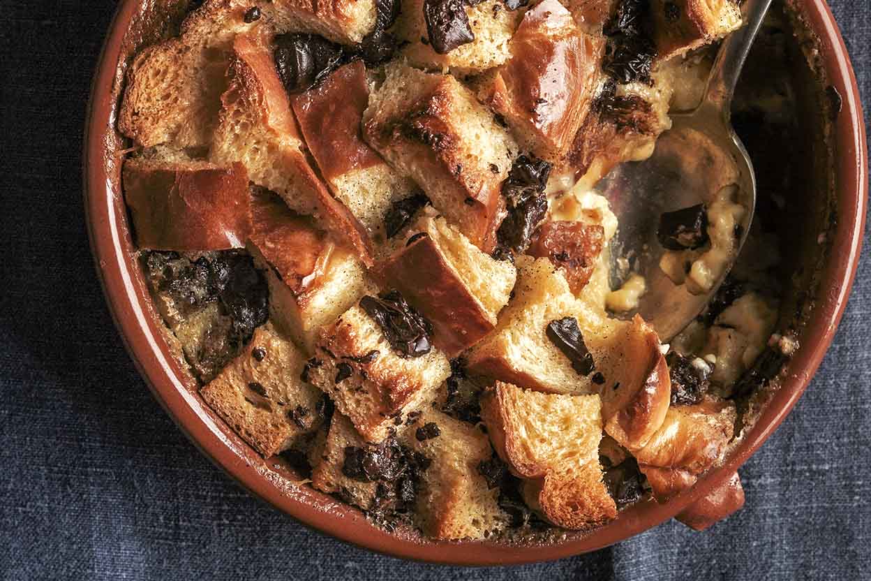 Vanilla Bread Pudding with Prunes and Chocolate