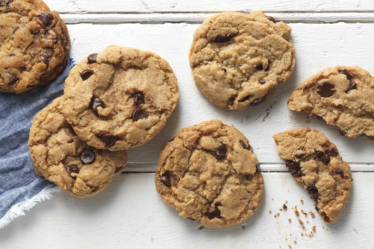 Chewy, bendy chocolate chip cookies can easily be made vegan with the help of flax meal (ground flax seed).