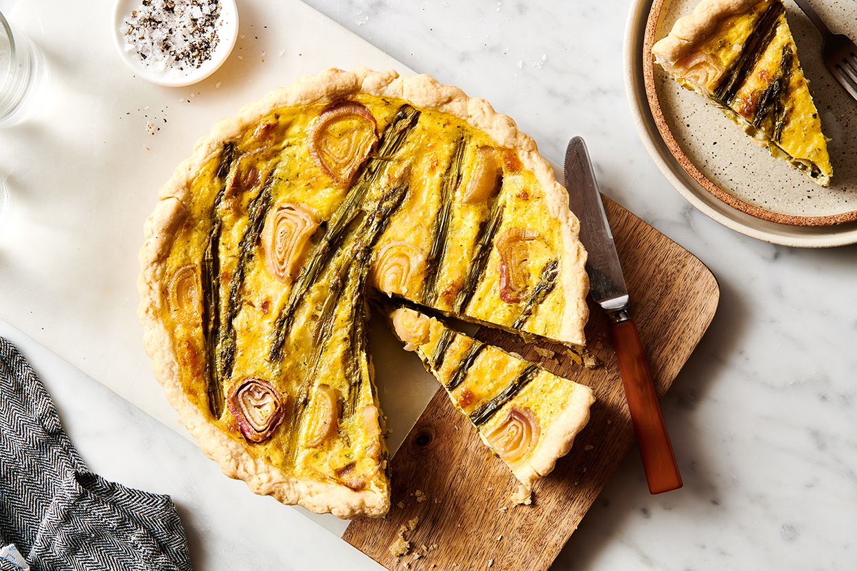 To prepare your quiche as pictured above, peel and slice 2 large shallots, and trim one bunch of asparagus. Arrange in a single layer on a baking sheet, drizzle with olive oil, and season with salt and pepper. Bake in a preheated 375°F oven for 15 minutes. Coarsely dice the roasted vegetables, leaving a few whole asparagus spears and shallot rings to garnish the top of the quiche. Use the vegetables in the quiche as directed in the recipe.