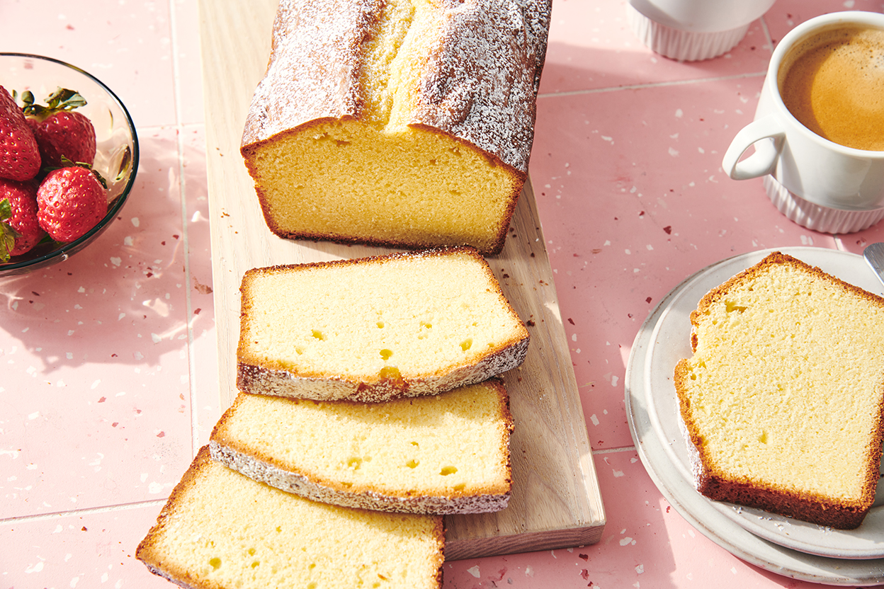 This pound cake — a rich dark brown outside, with a fine, golden crumb — is the perfect base for sliced fruit and a dollop of whipped cream.